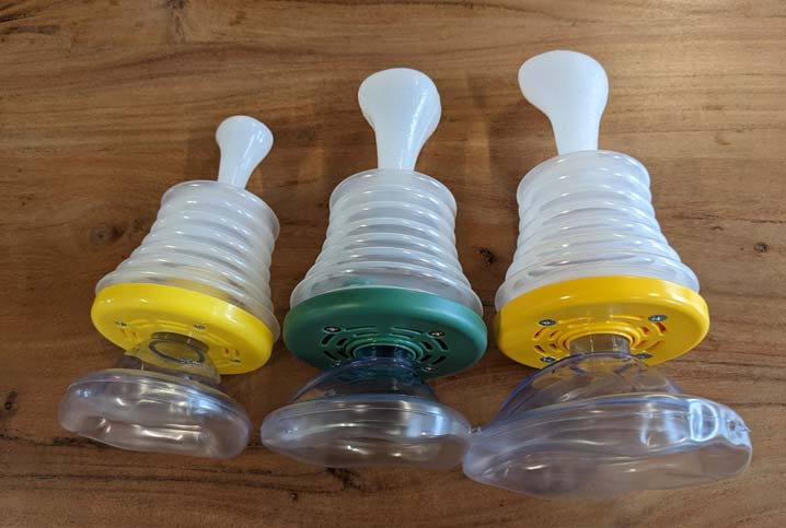 De gauche à droite : une petite contrefaçon jaune, une contrefaçon verte (toutes deux fabriquées en Chine) et le vrai LifeVac (fabriqué dans l'UE).
